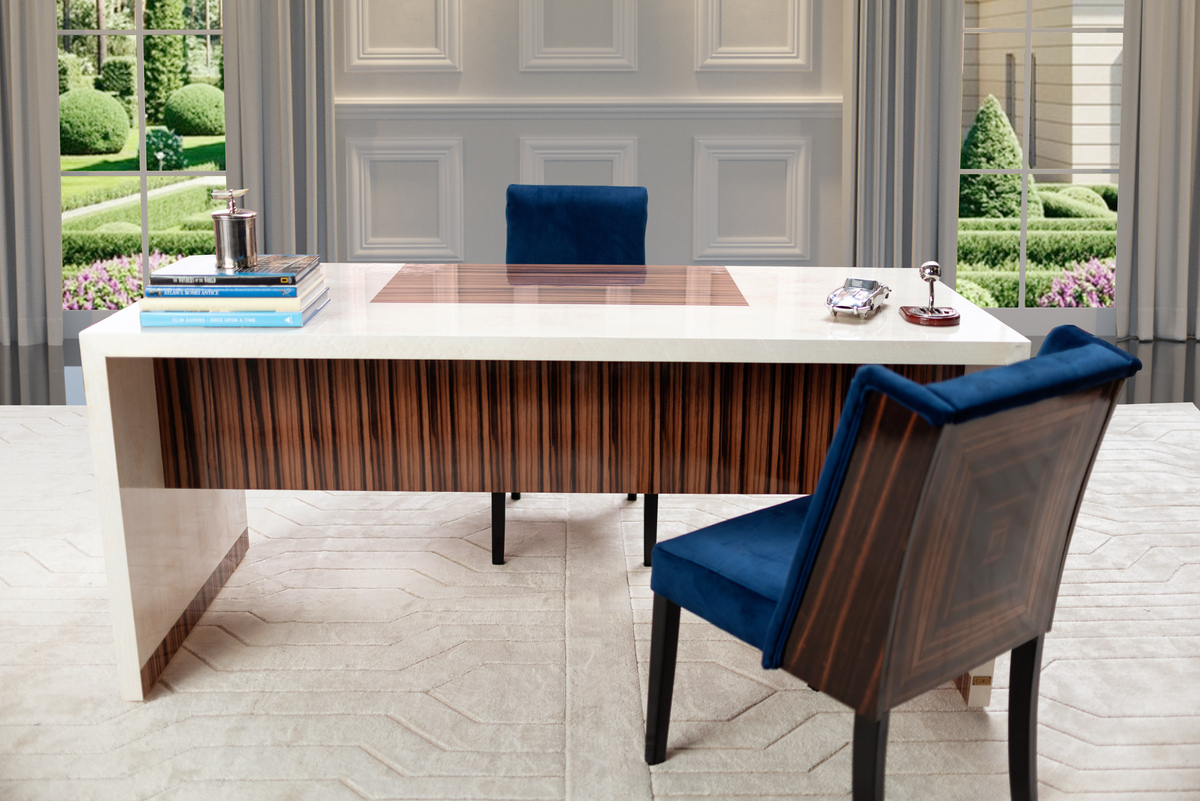 The XVII-th desk is an exceptional piece to step up any office game and to have functionality. The desk is manually executed in marquetries of light shade bird’s eye maple with macassar details, the drawers opening through push systems, having inside French velvet.